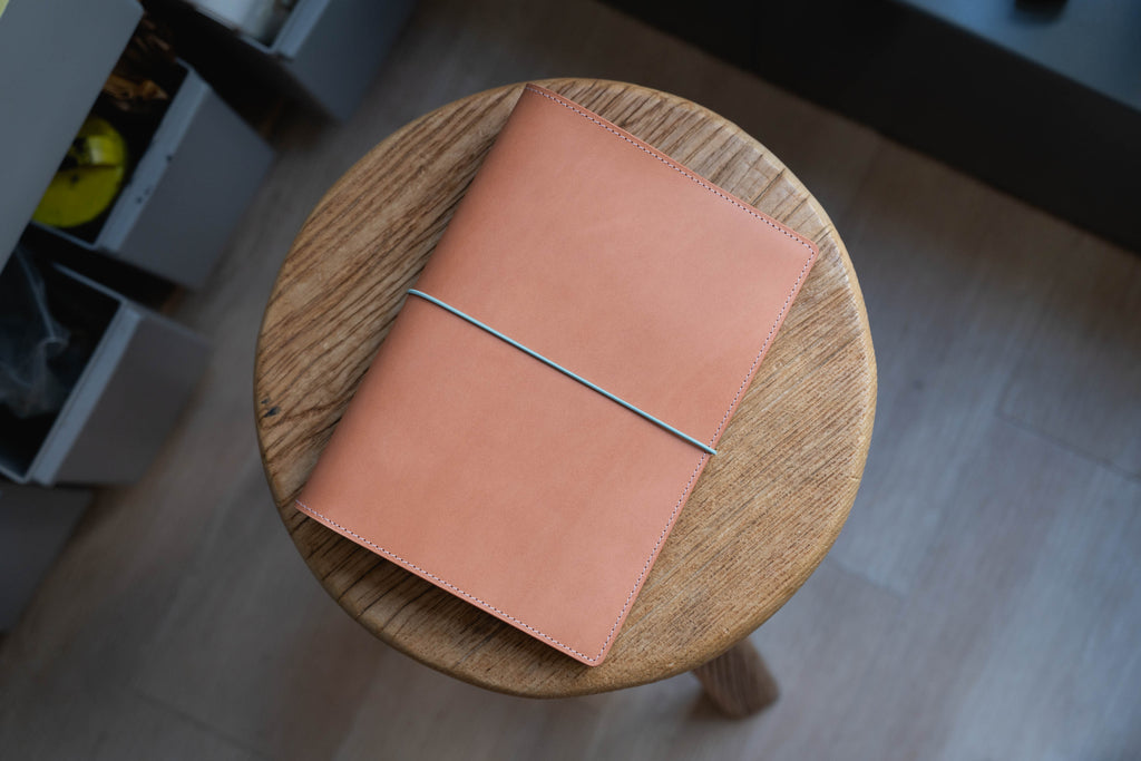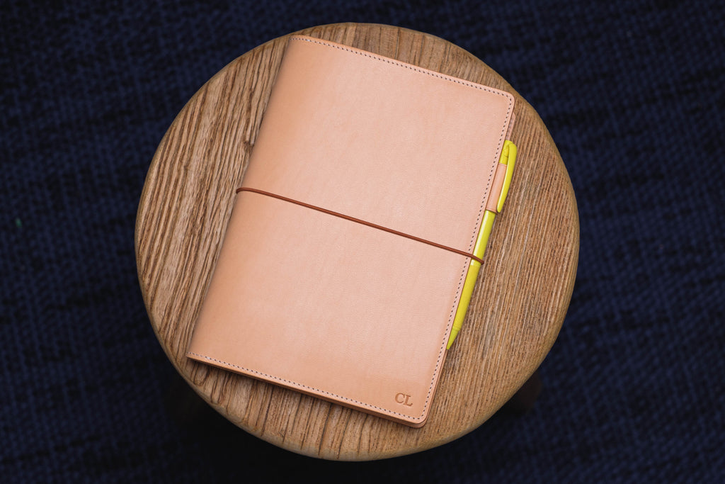 Impressively fast shipping and a beautiful cover. The leather is stiffer than I was expecting and feels very protective and sturdy. It is a lovely honey color and I look forward to seeing it age and develop a patina. The pen loop fits one of my larger fountain pens (a TWSBI 580) which is great. Very pleased with my purchase.