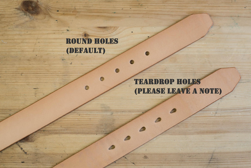 Each belt is made with 5 belt holes, each 1 inch apart. By default, the belt holes on the belt are round, but teardrop holes are available upon request. Please leave a note during checkout if you would like teardrop holes.