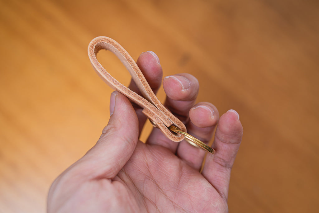 You're looking at a key fob constructed of 6oz thick full-grain Italian Buttero Vegetable tanned leather. Each key chain is equipped with a solid brass key ring and held together by a brass screw. The heavy-duty 6oz leather used ensures the durability of the key chain. Even the keyring could be swapped out if you ever need to replace it with a different one.