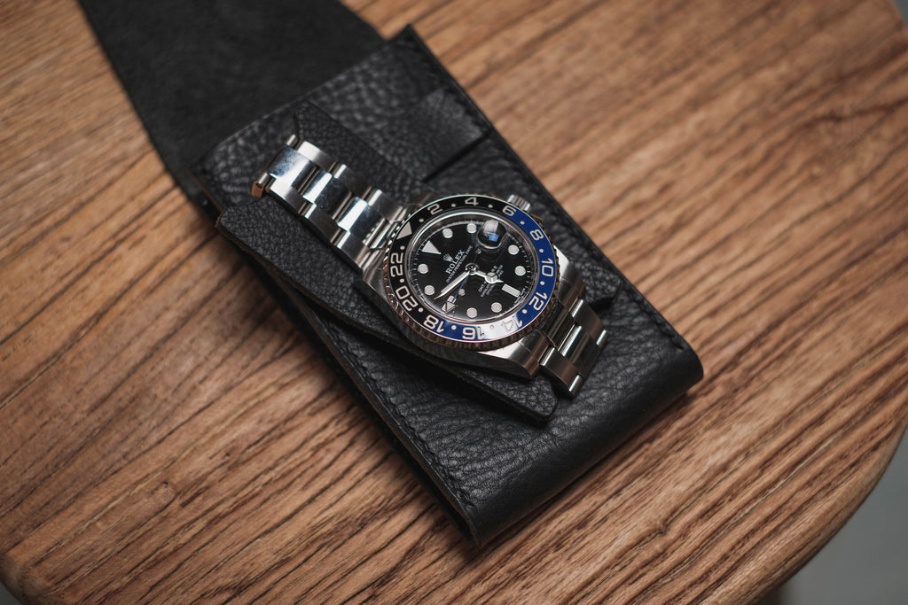 This type B watch pouch is designed with watches with a bracelet in mind. The length of the pouch is shortened and the slightly increased depth will better accommodate watches with a bracelet. Our leather watch pouches are constructed from top quality Italian Minerva Box leather, which is thick yet supple. We pay extra attention to detail on the design and the choice of material on our watch pouches, we chose a supple leather as we would not want the leather itself to scratch the watch. More importantly, no metal parts are used for the closure ( no snaps, no metal studs or magnets). This way, you won't have to worry about the closure scratching your beloved collection. The leather tongue tucks into the slot for closure, so you would not need to apply pressure to your watches when attempting to close the pouch. We have also added an optional case back protector if you need it to prevent your metal bracelet from scratching your case back.