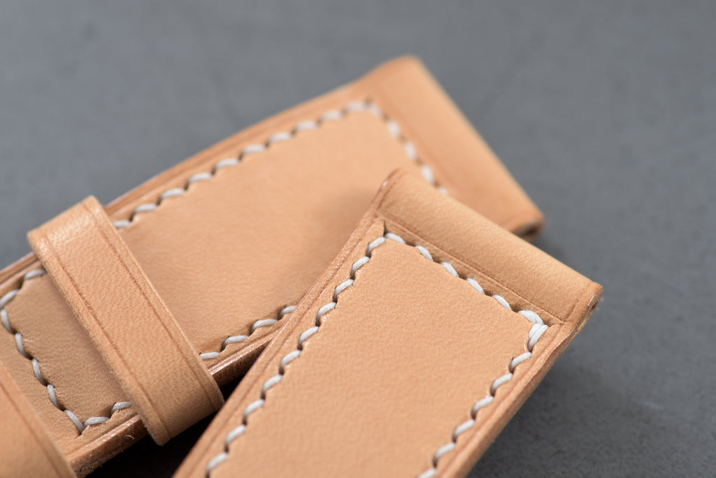 Our "Heritage" watch strap designed for Panerai watches is constructed of natural vegetable tanned leather. The edge creases and the box stitch on the watch strap stay true to the original design of the original military issued Panerai leather straps used by frogmen and divers. The watch strap is entirely made and stitched by hand to ensure the strap's durability.