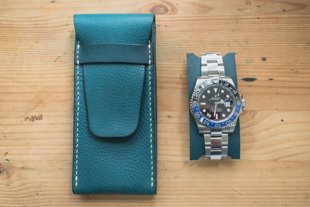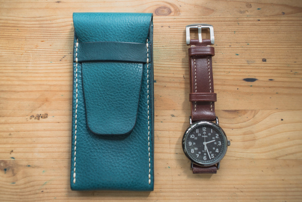 The watch pouch is entirely hand sewn and has burnished edges.